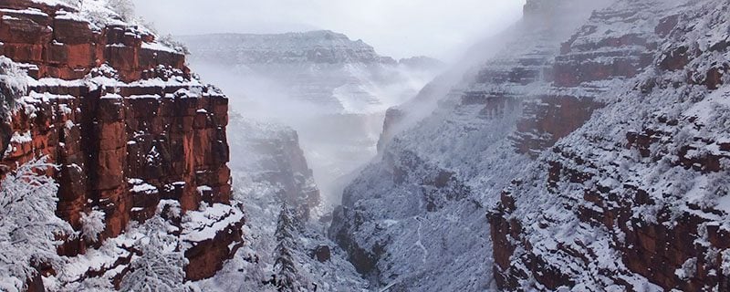 Our Winter Rim to Rim to Rim hiking tour is a rare opportunity to hike the Grand Canyon’s most famous trails, see both rims in winter, and experience the amazingly diverse micro-climates in the Canyon, all while having it nearly all to yourself. We begin and end on the South Rim, crossing the Colorado River near Phantom Ranch, and continue up to a high camp where we day hike to the North Rim. And we see desert oases, geological phenomena, Native American ruins, box canyons and more en route!