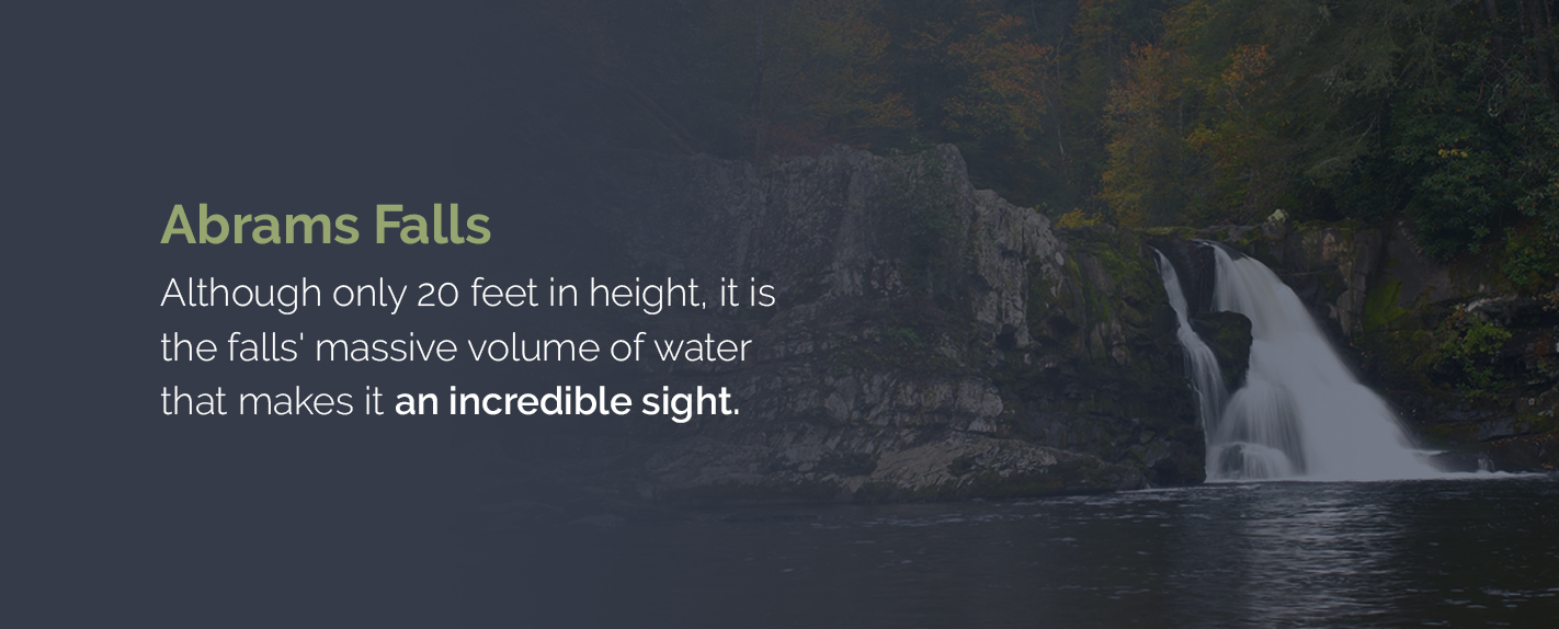 Abrams Falls was named after a Cherokee chief who lived just a few miles downstream. Although only 20 feet in height, it is the falls’ massive volume of water that makes it an incredible sight. The deep, long pool at the falls’ base is also picturesque.