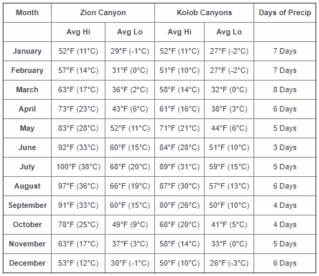 Below are the average temperatures and days of precipitation in Zion Canyon and Kolob Canyons