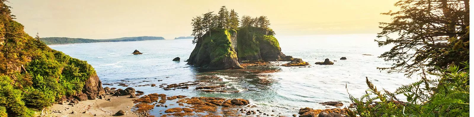 Olympic National Park oceanic shot beautiful rocks and evergreen tress line the shore
