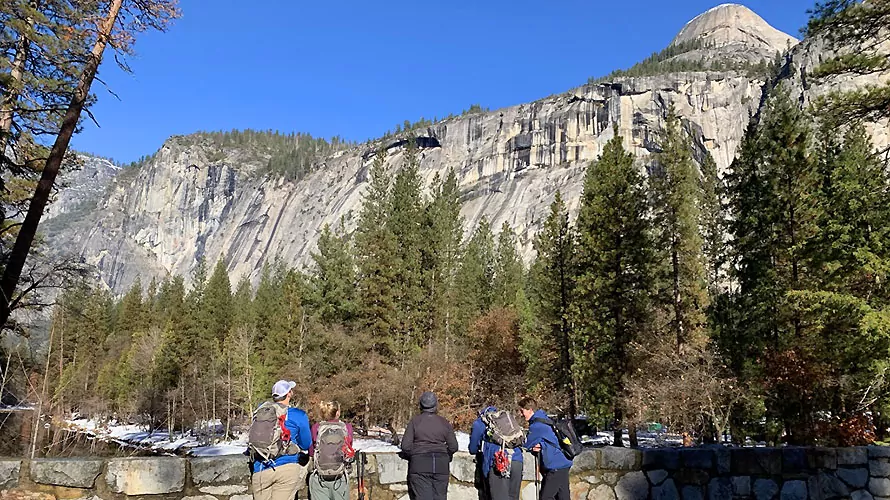 This trip follows well maintained trails. Some concerns include loose dirt, large stepping stones and tree roots. The top of Vernal/Nevada falls has exposed vertical drops with safety railings in place. Trails can be icy or snowy on this trip so be prepared to careful with your footing on variable surfaces.