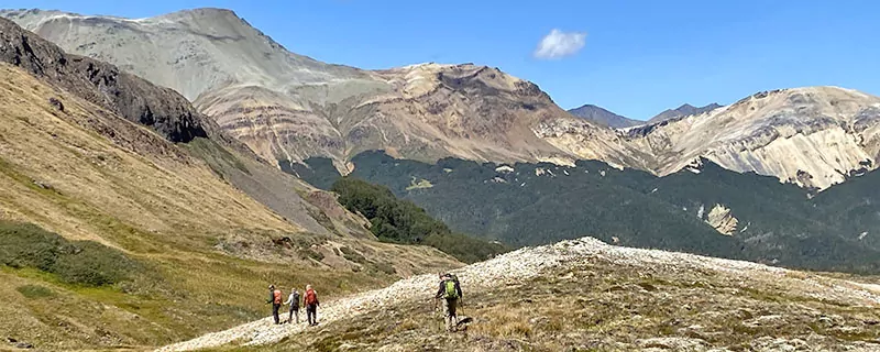 After a hefty breakfast at the ranch, we’ll pack up and head into the mountains. We meet the local families and their horses who will support our trek. After dividing and organizing food and gear for the horses to carry, we’ll set off on our adventure. We start by winding through a traditional Patagonian campo (grass plain with stunted trees) before heading higher into the mountains. The uphill makes us grateful for the horses! Our campsite is a spectacular perch overlooking the Jeinimeni Mountains, where we have the opportunity to spend time with an experienced gaucho tending sheep in the high mountains. In the evening, we’ll gather around a fire for conversation about Patagonian history and culture.