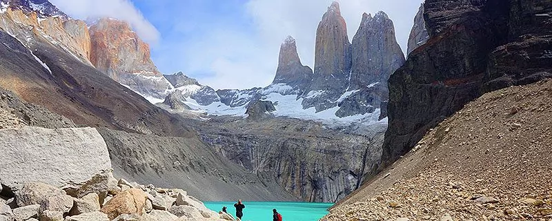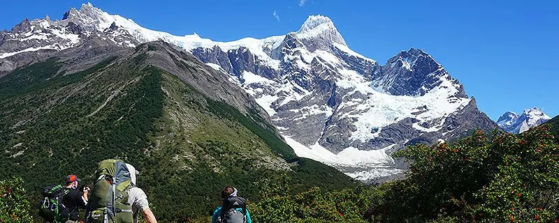 Alpine lake and granite spires of Torres del PaineHikers with turquoise lake in the background in Torres del Paine National Park, ChileGlacial fed lake and snow-capped mountains in Patagonia, ChileKayaker in Torres del Paine National Park in ChileTowering mountains and mountain lakes of Patagonia, ChileGuide pointing out terrain features to clients in Torres del Paine, ChileGlaciers, lake and peaks in Torres del Paine, ChileWildland Trekking group of hikers in Torres del Paine, Patagonia