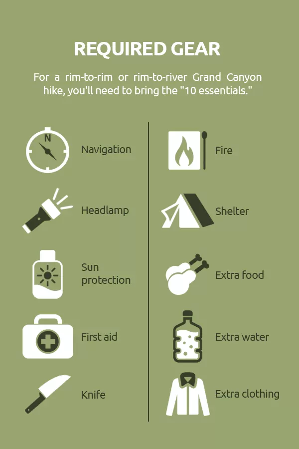 Preparation for a Grand Canyon hike also requires hikers to adjust to the weight of their gear. For a rim-to-rim or rim-to-river Grand Canyon hike, you’ll need to bring the “10 essentials.”