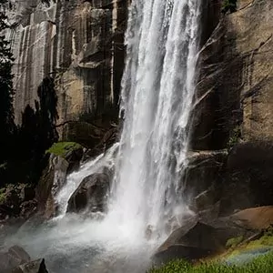This moderate to strenuous hike on the Mist Trail begins at Happy Isle (shuttle stop #16). It leads you up close and personal with two waterfalls, that are roaring in the springtime and alluring year-road. For a shorter hike that still provides spectacular views, the Vernal Fall footbridge is a 1.6 mile round-trip hike, with 400 feet elevation gain. This footbridge offers great views of the majestic Vernal Fall. Just after the bridge, about .2 miles, the Mist Trail and the John Muir Trail separate. The Mist Trail continues to the top of Vernal Fall, a 2.6 mile round-trip hike. Climbing an additional 600 feet in elevation, the trail goes up a series of stairs containing over 600 steps. At the top of Vernal Fall, you are able to look straight down at the entirety of the fall, 317 feet. Continuing past Vernal Fall, the Mist Trail climbs another 1000 feet in elevation on steep switchbacks, to bring you to the top of Nevada Fall. Once at the top of the climb, look for a bridge that crosses the Merced River and takes you to a closer view of the fall. Round-trip to the top of Nevada Fall and back is 5.4 miles.