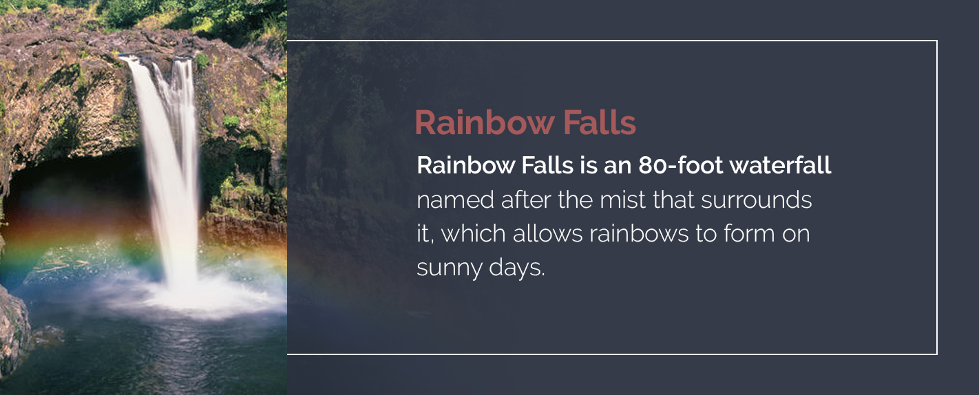 Rainbow Falls is an 80-foot waterfall named after the mist that surrounds it, which allows rainbows to form on sunny days.