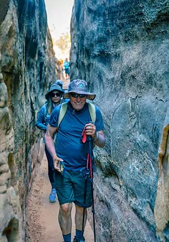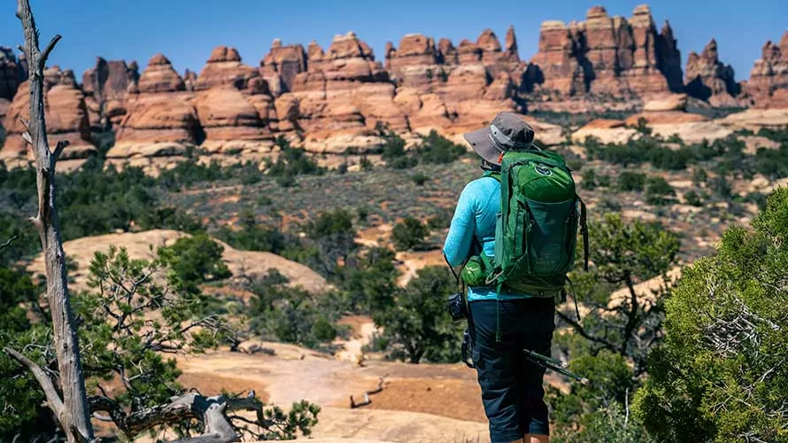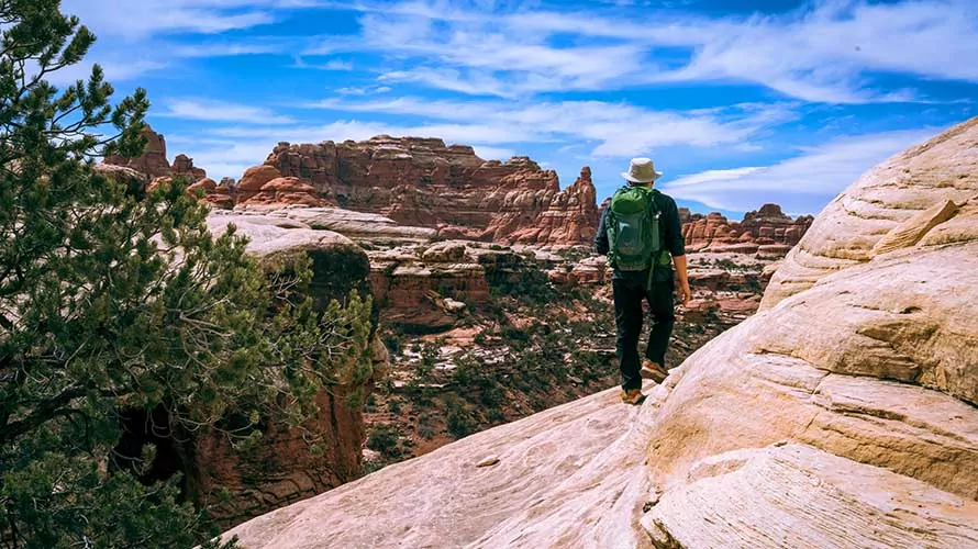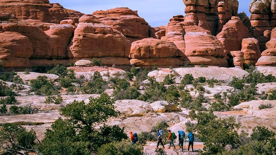 This full-day, moderately strenuous hike will take you on an 11-mile journey through some of the most beautiful landscapes in Canyonlands National Park. We begin and end in Moab, where a 1.5 hour drive takes us south to the remote Needles District entrance to Canyonlands and our trailhead. On the hike you’ll experience stunning panoramic views of the surrounding canyons and rock formations, as well as fascinating natural and cultural history of the area shared by your guide. Our final destination is the highlight of the hike – the magnificent Druid Arch itself. We will have lunch beneath the titanic arch and take time to capture stunning photos of its grandeur. Once we’ve had our fill, we’ll hike back to our starting point with 180-degree different views, which gives us a completely new perspective of the area. A relaxing, scenic 1.5 hour drive back to Moab rounds out the day before we drop you at your hotel.