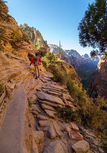 This hike has extreme exposure with long drop-offs, and is a strenuous climb. It is not for young children or anyone fearful of heights. A portion of the hike is paved, but the last section runs along the spine of a steep, narrow ridge to the summit with drop-offs on both sides. There are chains that hikers can grab onto on some of the very exposed sections. Unfortunately, people fall to their deaths occasionally from Angels Landing, so be sure you’re physically and mentally prepared for this hike. If you are, you’ll have an amazing time!